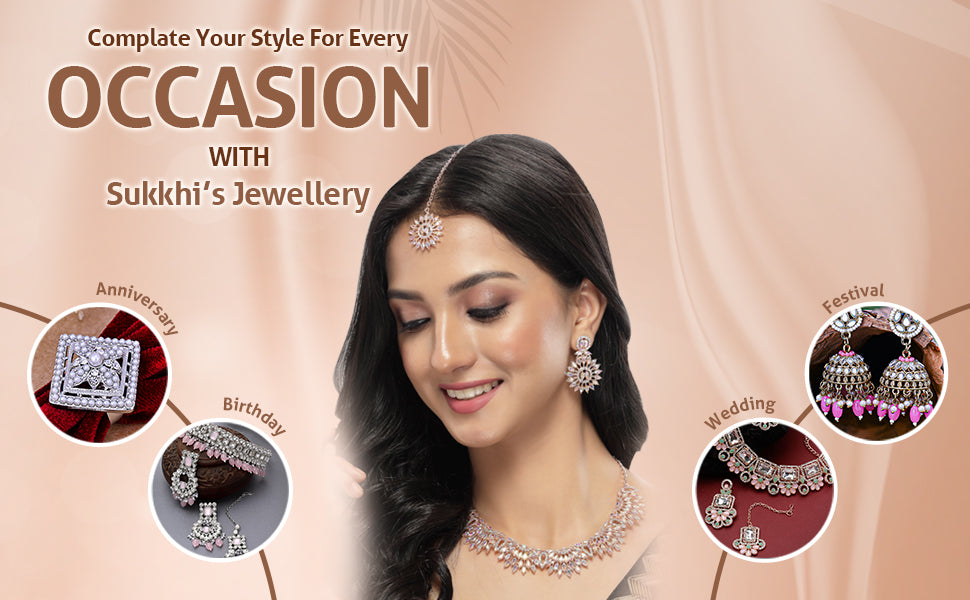 * Complete Jewelry Ensemble: With a coordinated collar bone necklace, earrings, and Maangtika, this Sukkhi jewellery set provides a well-matched and complete ensemble, suitable for weddings, parties, and special occasions.