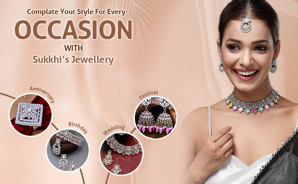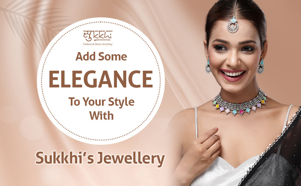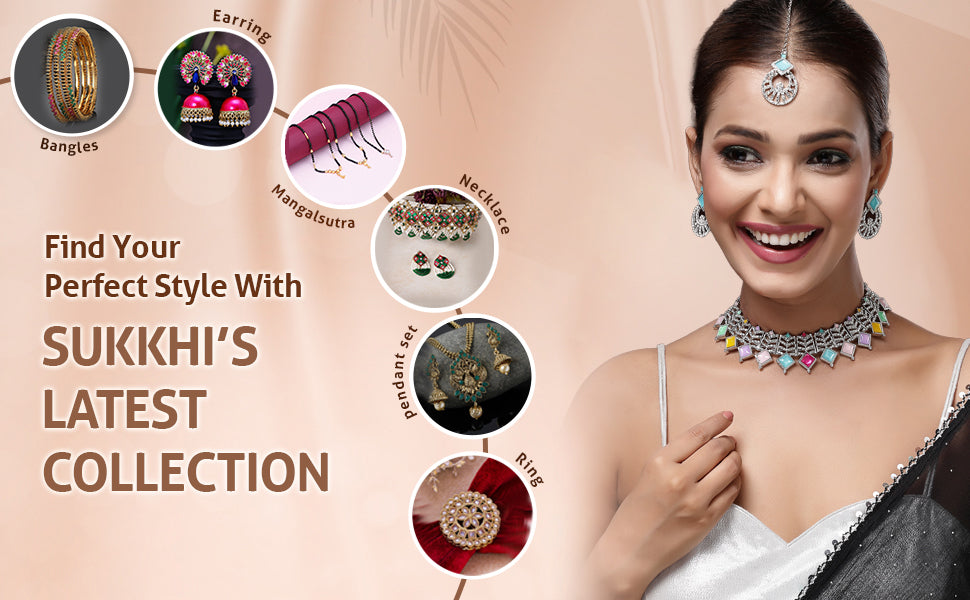 Sukkhi Bewitching Rhodium Plated AD Stones & Beads Choker Necklace Set With Earring And Maangtika | Jewellery Set For Women Elevate your festive style with the Sukkhi Bewitching Choker Necklace Set, designed with a sleek rhodium plated finish. This captivating set features a beautifully crafted choker embellished with sparkling AD stones and finely arranged beads, paired with matching earrings and a maangtika. Perfect for weddings, traditional functions, or special celebrations, it adds a refined and graceful touch to your attire. The intricate detailing and balanced design make it suitable for both ethnic and fusion outfits. Whether you're dressing up for an occasion or looking for a thoughtful gift, this jewellery set offers elegance and charm in a complete ensemble.