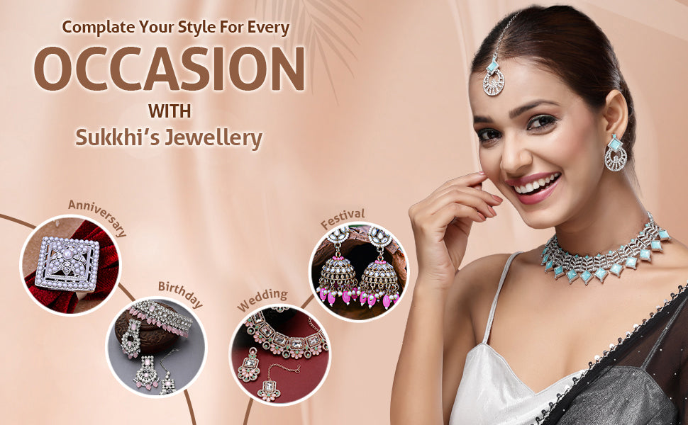 Sukkhi Classic Rhodium Plated AD Stones & Beads Choker Necklace Set With Earring And Maangtika | Jewellery Set For Women Add timeless charm to your look with the Sukkhi Classic Choker Necklace Set, crafted in a refined rhodium plated finish. This beautifully designed set includes a choker necklace adorned with shimmering AD stones and delicate beads, perfectly matched with coordinating earrings and a maangtika. Suitable for weddings, festivals, and special events, it pairs well with both traditional and fusion outfits. The graceful design and sparkling accents bring a polished touch to your ensemble. Whether you're dressing up for a celebration or adding elegance to a festive outfit, this jewellery set offers a complete and stylish finishing touch.