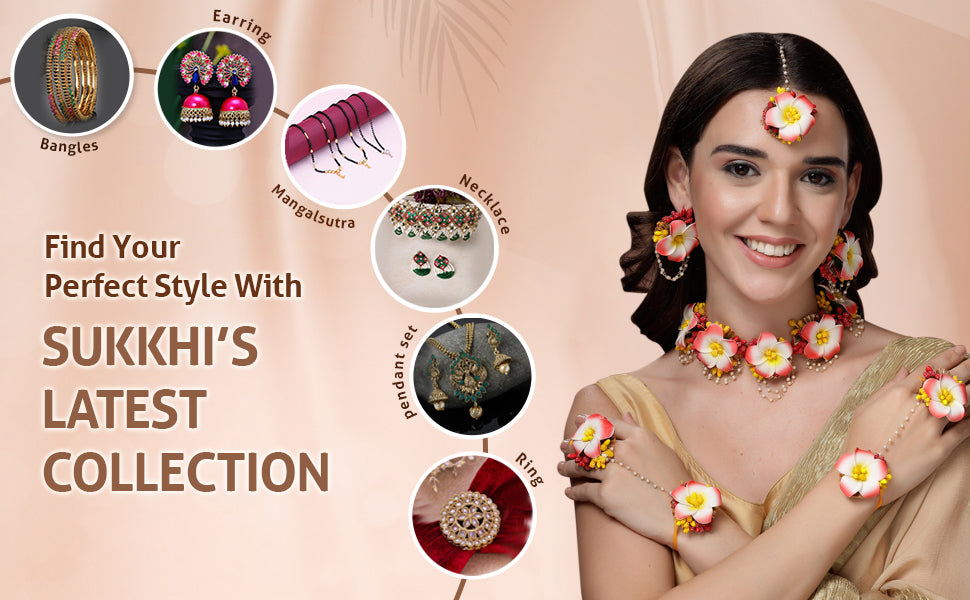 Sukkhi Creative Stylish Fashion Flowers Handmade Yellow Red Jewellery Set for Haldi Gota Patti Necklace Earrings Bracelet & Maangtikka for Women & Girls|Mehandi/Haldi/Wedding/Bridal/Baby Shower|NS107468|Embrace festive charm with the Sukkhi Creative Stylish Fashion Flowers Handmade Yellow Red Jewellery Set, perfect for Haldi, Mehendi, weddings, bridal events, and baby showers. This beautifully crafted set features a necklace, earrings, bracelet, and maangtikka, all adorned with intricate Gota Patti work and vibrant floral designs in yellow and red. Designed for women and girls who love traditional styles with a modern twist, this set complements ethnic outfits effortlessly. Its bright colors and detailed craftsmanship make it a standout choice to celebrate special moments, adding an elegant and joyful touch to your festive attire.
