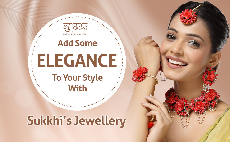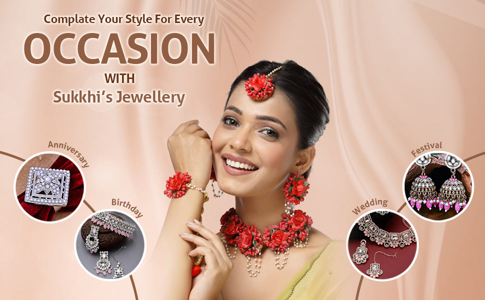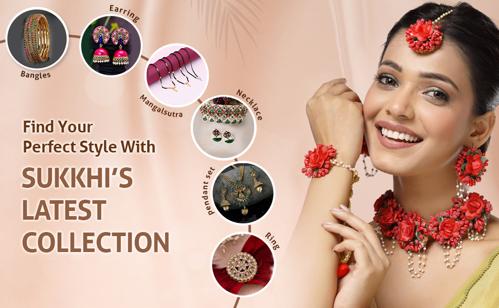 Sukkhi Decorative Stylish Fashion Flowers Handmade Red Jewellery Set for Haldi Gota Patti Necklace Earrings Bracelet & Maangtikka for Women & Girls|Mehandi/Haldi/Wedding/Bridal/Baby Shower|NS107464|Add a festive touch to your special occasions with the Sukkhi Decorative Stylish Fashion Flowers Handmade Red Jewellery Set. Designed with intricate Gota Patti work, this set includes a necklace, earrings, bracelet, and maangtikka, beautifully crafted for traditional celebrations like Haldi, Mehendi, weddings, and baby showers. The vibrant red floral design brings charm and freshness, making it a delightful choice for brides, bridesmaids, or anyone celebrating joyous moments. Lightweight and easy to wear, it complements ethnic wear and adds a cheerful, graceful vibe to your look. Celebrate your events with this charming and thoughtfully designed floral jewellery set.