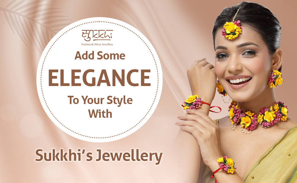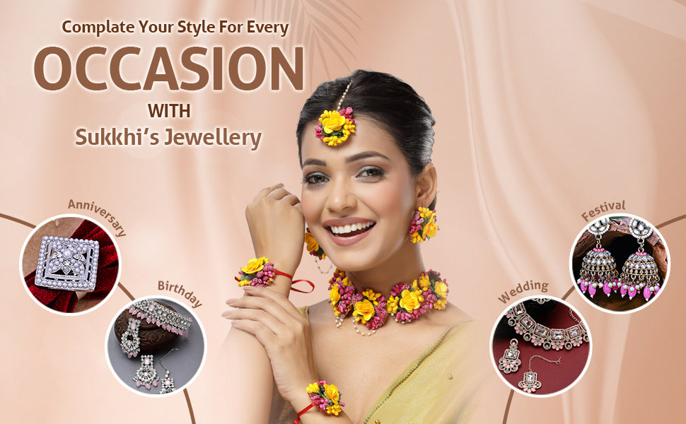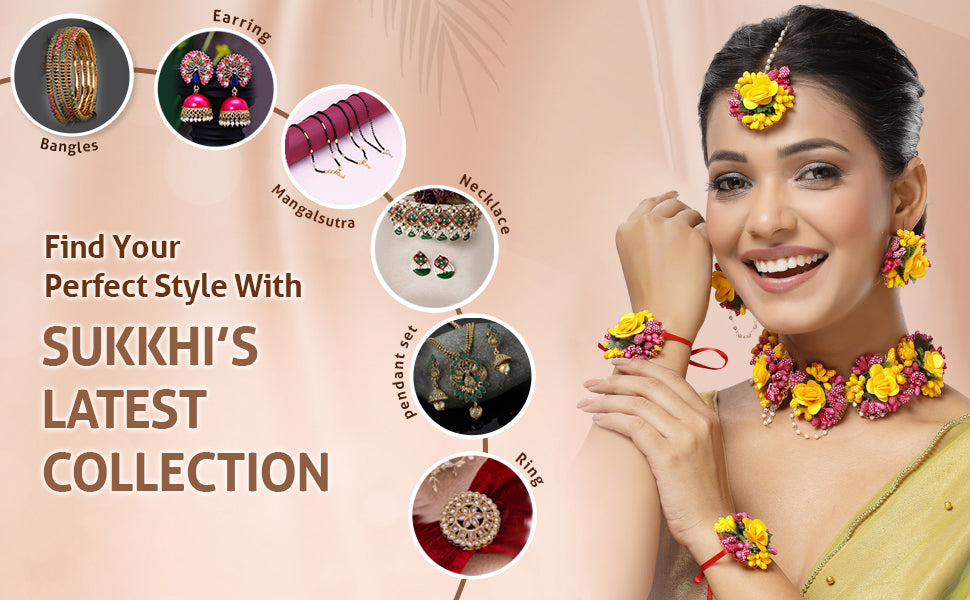 Sukkhi Decorative Stylish Fashion Flowers Handmade Yellow Red Jewellery Set for Haldi Gota Patti Necklace Earrings Bracelet & Maangtikka for Women & Girls|Mehandi/Haldi/Wedding/Bridal/Baby Shower|NS107467|Celebrate tradition with a vibrant twist wearing the Sukkhi Decorative Stylish Fashion Flowers Handmade Yellow Red Jewellery Set. Designed especially for occasions like Haldi, Mehendi, weddings, bridal functions, and baby showers, this set includes a floral necklace, earrings, bracelet, and maangtikka adorned with Gota Patti detailing. The cheerful combination of yellow and red adds charm and festivity to your outfit. Lightweight and crafted for easy wear, it pairs beautifully with traditional ensembles, enhancing your ethnic look. Whether you're a bride or a guest, this floral jewellery set adds the perfect touch of celebration and cultural flair to your appearance.