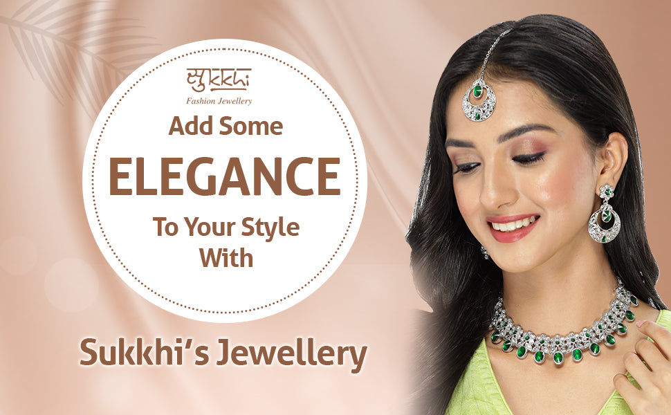 Step into a world of dreamy elegance with the Sukkhi Dreamy Rhodium Plated Green AD White Stones & Beads Collar Bone Necklace Earring with Maangtika Jewellery Set. This exquisite set captivates with a collar bone necklace adorned with sparkling green AD stones and delicate beads in a radiant silver setting. The matching earrings and maangtika (forehead ornament) complete the ensemble, adding a touch of timeless allure to your look. Plated in resplendent rhodium, this jewelry set seamlessly blends modern design with a touch of sophistication. Whether it's a wedding, party, or any special occasion, the Sukkhi jewelry set will make you stand out with its captivating beauty and poise. A must-have addition to every woman's cherished collection, defining grace and versatility in style.