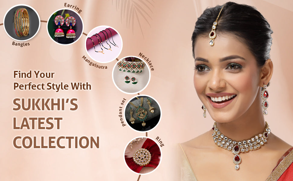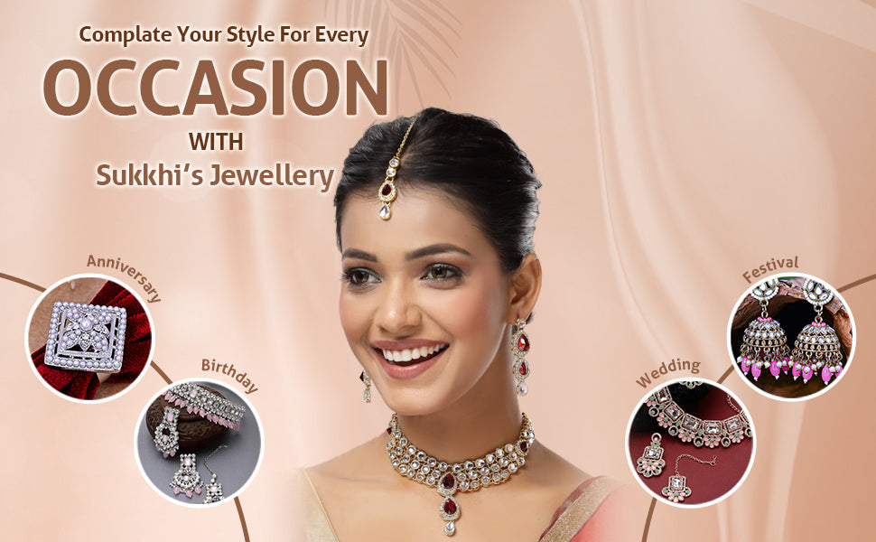 Sukkhi Elegant Stylish Gold Plated Kundan Studded Red Choker Necklace with Drop Earring Maangtikka Jewellery Set for Women & Girls|NS107378|Add charm to your festive attire with the Sukkhi Elegant Stylish Jewellery Set. This gold-plated choker necklace is adorned with vibrant red tones and detailed Kundan work, creating a standout look perfect for traditional celebrations. The set includes matching drop earrings and a coordinated maangtikka, making it an ideal pick for weddings, family gatherings, and cultural festivities. Designed to pair beautifully with sarees, lehengas, or ethnic gowns, this ensemble brings a balanced blend of tradition and modern appeal. Its intricate detailing and coordinated accessories offer a complete look that enhances your overall appearance for any special occasion.