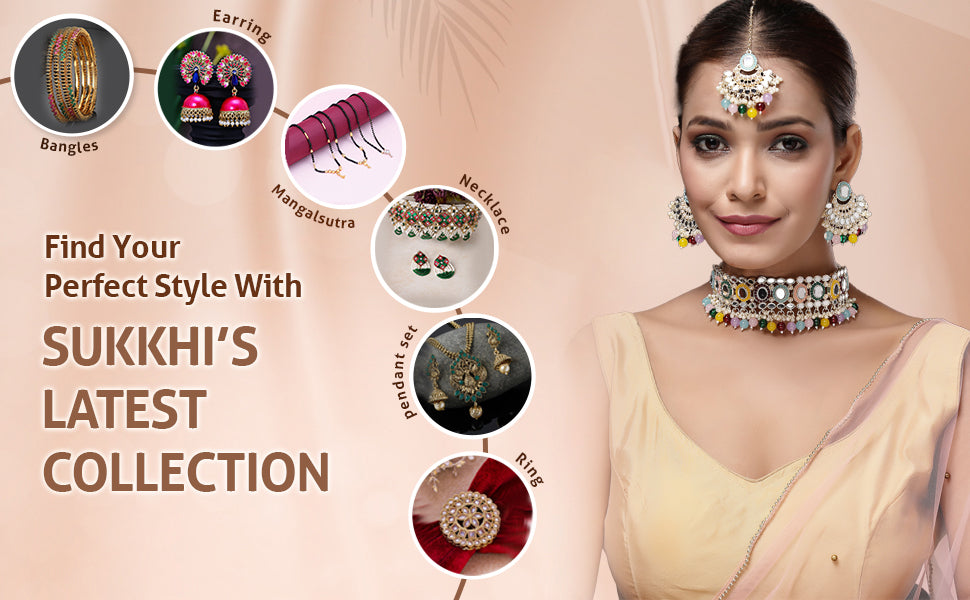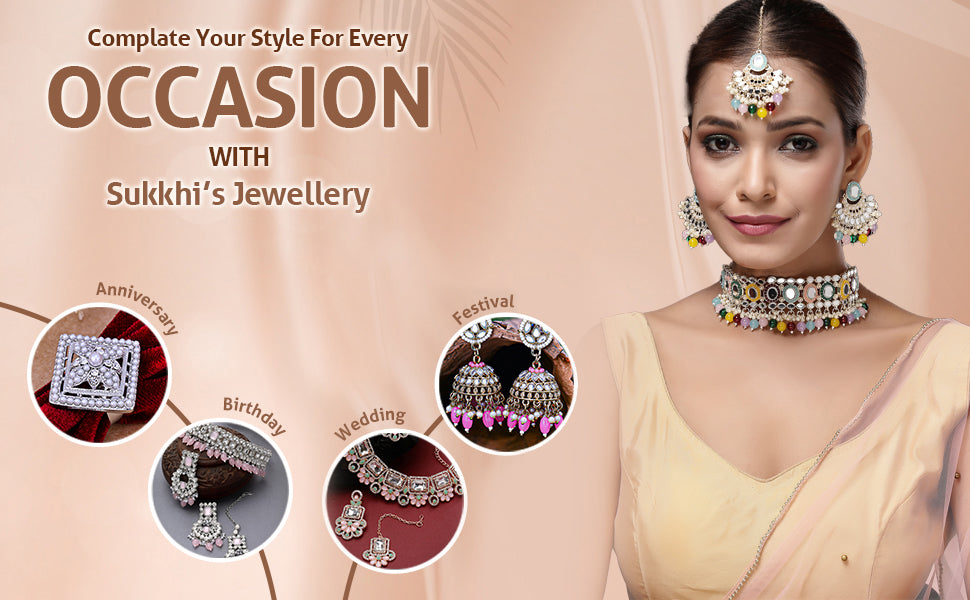 * Trendy Ethnic Set: This jewellery set offers a fashionable touch with its detailed choker, drop earrings, and coordinated maangtikka—ideal for festive styling.