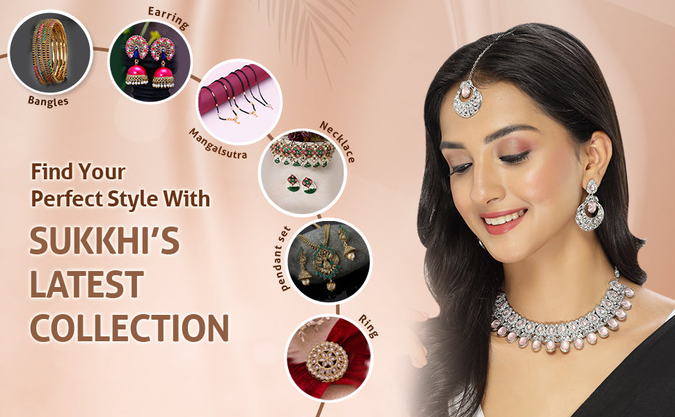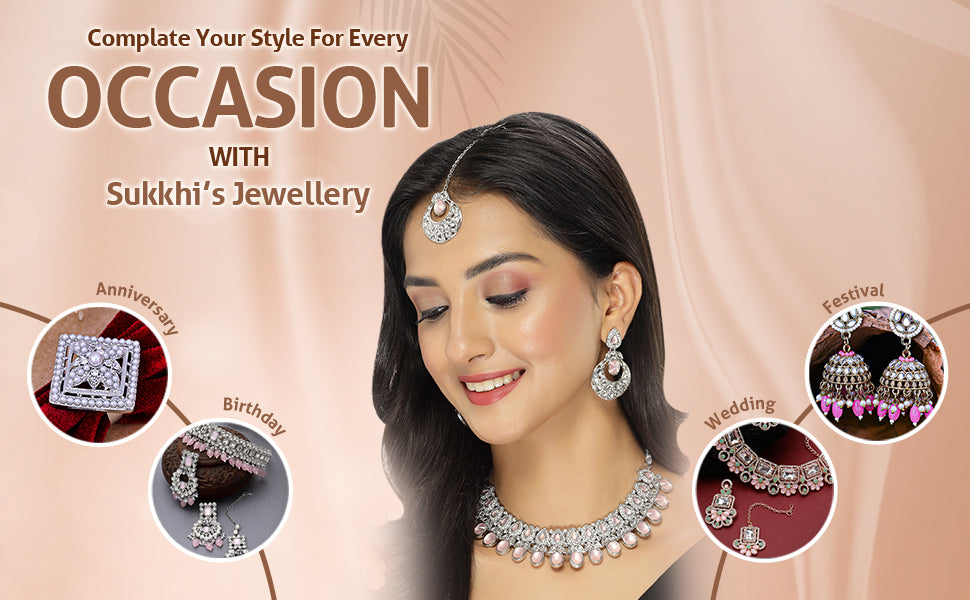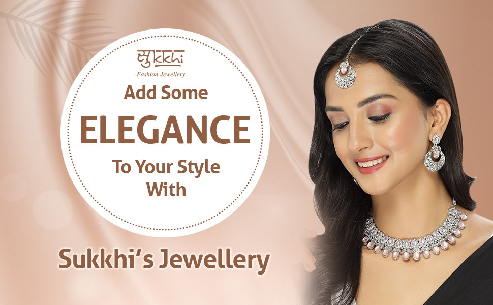 Experience felicity with the Sukkhi Felicitous Rhodium Plated Pink AD Stone Collar Bone Necklace Earring with Maangtika Jewellery Set. This exquisite set captivates with a collar bone necklace adorned with sparkling pink AD stones in a radiant rhodium-plated setting. The design exudes grace and sophistication, adding a touch of timeless allure to your look. The matching earrings and maangtika (forehead ornament) complete the ensemble, creating a stunning and cohesive jewelry set. Plated in resplendent rhodium, this jewelry set seamlessly blends classic design with a hint of luxury. Elevate your style with the Sukkhi jewelry set, and make a statement with its captivating beauty and poise. A must-have addition to every woman's cherished collection, defining grace and versatility in style.