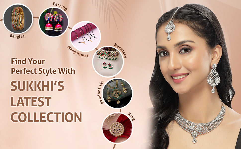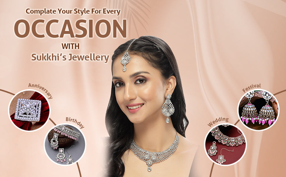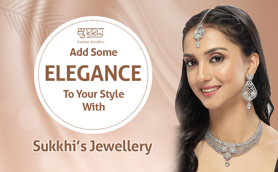 Revel in the artistry of the Sukkhi Geometric Rhodium Plated Silver AD White Stone Collar Bone Necklace Earring with Maangtika Jewellery Set. This exquisite set captivates with a collar bone necklace adorned with sparkling white AD stones in a radiant rhodium-plated setting. The geometric design exudes modernity and sophistication, adding a touch of unique allure to your look. The matching earrings and maangtika (forehead ornament) complete the ensemble, creating a stunning and cohesive jewelry set. Plated in resplendent rhodium, this jewelry set seamlessly blends contemporary design with a hint of luxury. Whether it's a wedding, party, or any special occasion, the Sukkhi jewelry set will make you stand out with its captivating beauty and poise. A must-have addition to every woman's cherished collection, defining grace and versatility in style.