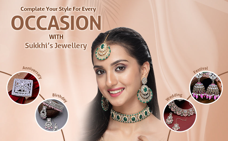 * Complete Jewelry Ensemble: With a coordinated choker necklace, earrings, and Maangtika, this Sukkhi jewellery set provides a well-matched and complete ensemble, suitable for weddings, festivals, and special occasions.