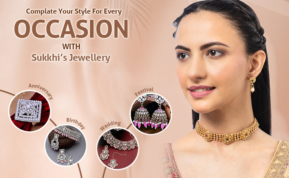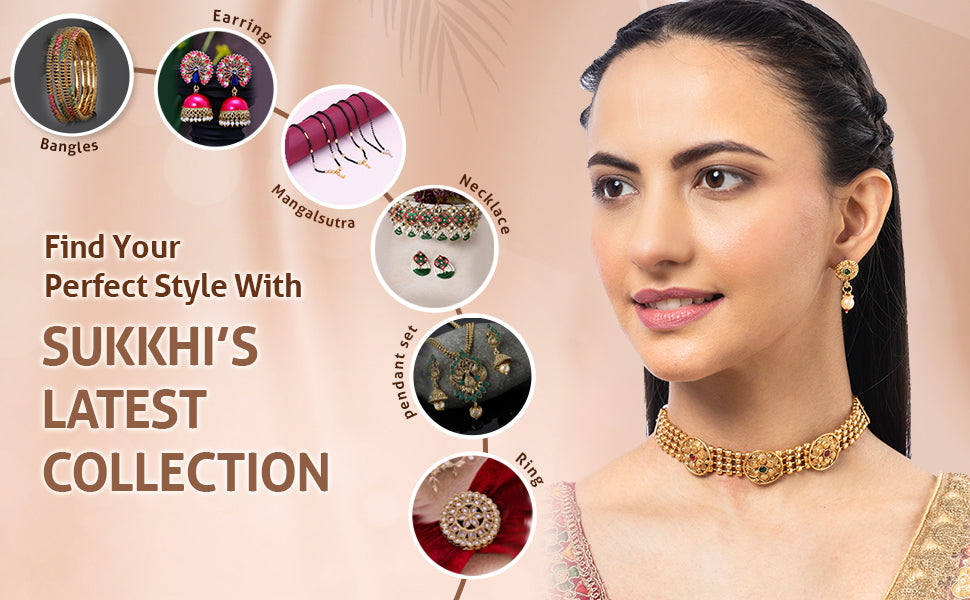 * Elegant Design: Sukkhi gold-plated floral choker necklace set features a graceful design, adding charm to any traditional outfit. Gold Plating: Finished with a radiant gold-plated coating, ensuring a striking look and lasting shine.