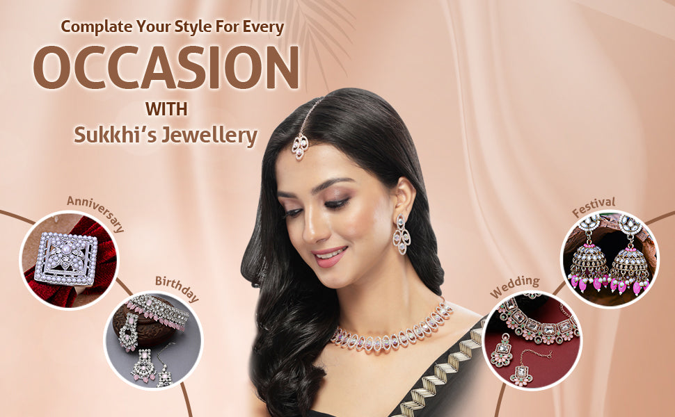 * Complete Jewelry Ensemble: With a coordinated collar bone necklace, earrings, and Maangtika, this Sukkhi jewellery set provides a well-matched and complete ensemble, suitable for weddings, parties, and special occasions.