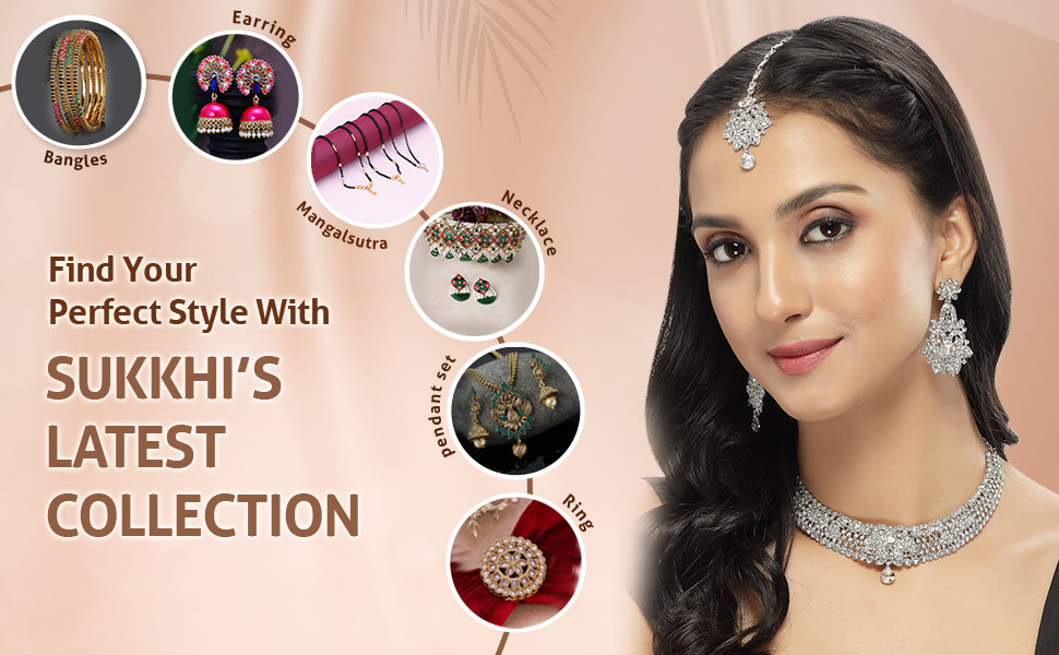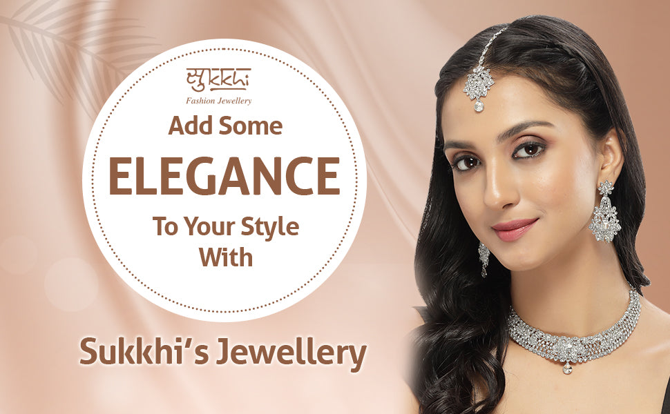 Experience the magnificence of the Sukkhi Magnificent Rhodium Plated Silver AD White Stones Collar Bone Necklace Earring with Maangtika Jewellery Set. This exquisite set captivates with a collar bone necklace adorned with sparkling white AD stones in a radiant rhodium-plated setting. The design exudes grace and sophistication, adding a touch of timeless allure to your look. The matching earrings and maangtika (forehead ornament) complete the ensemble, creating a stunning and cohesive jewelry set. Plated in resplendent rhodium, this jewelry set seamlessly blends classic design with a hint of luxury. Whether it's a wedding, party, or any special occasion, the Sukkhi jewelry set will make you stand out with its captivating beauty and poise. A must-have addition to every woman's cherished collection, defining grace and versatility in style.