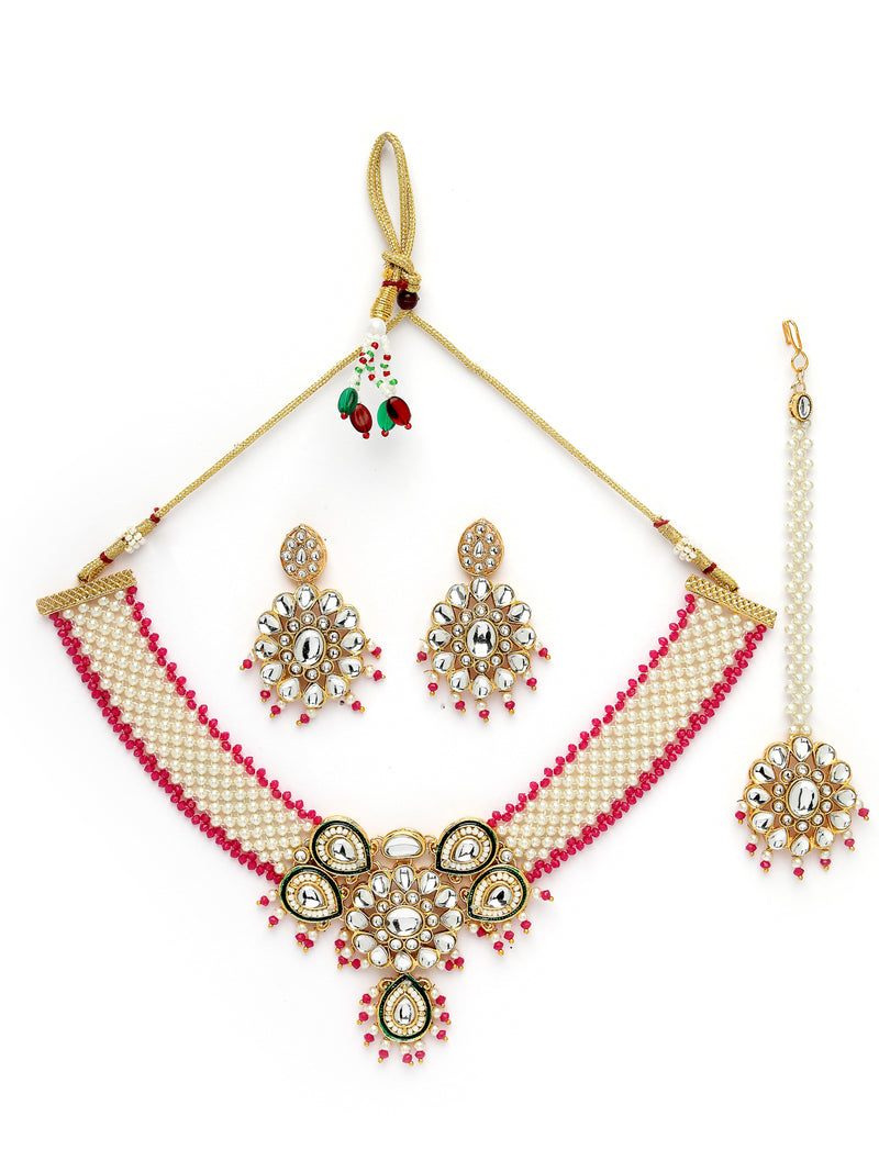 * Elegant Design: Sukkhi Pretty Pink Gold Tone Choker Necklace Set features white pearls and Kundan stones, offering a graceful and traditional appeal. Gold Plating: The intricate gold tone plating enhances the beauty of the pearls and Kundan embellishments.