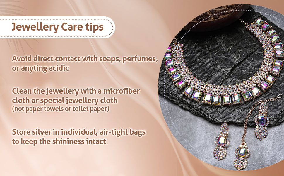* Complete Jewellery Set: The Sukkhi Striking Rose Gold Plated Rainbow Stones Collar Bone Necklace Earring with Maangtika Jewellery Set offers a complete ensemble, making it a perfect choice for weddings, parties, and special occasions. It's a thoughtful gift option and a stunning addition to your jewellery collection.
