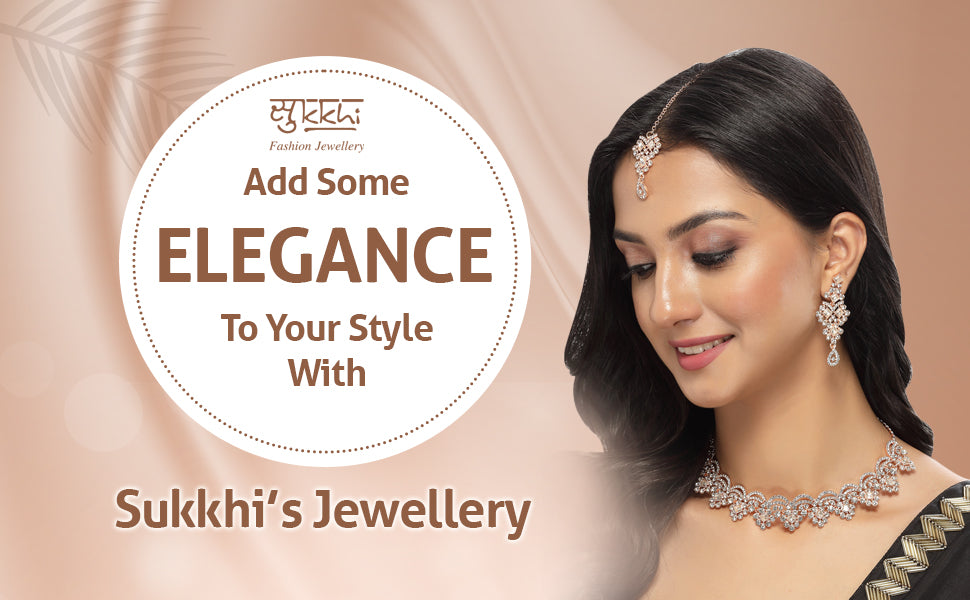 Unleash the untamed beauty with the Sukkhi Untamed Rose Gold Plated AD White Stone Collar Bone Necklace Earring with Maangtika Jewellery Set. This exquisite set captivates with a collar bone necklace adorned with sparkling white AD stones in a radiant rose gold-plated setting. The design exudes grace and sophistication, adding a touch of timeless allure to your look. The matching earrings and maangtika (forehead ornament) complete the ensemble, creating a stunning and cohesive jewelry set. Plated in resplendent rose gold, this jewelry set seamlessly blends modern design with a hint of luxury. Whether it's a wedding, party, or any special occasion, the Sukkhi jewelry set will make you stand out with its captivating beauty and poise. A must-have addition to every woman's cherished collection, defining grace and versatility in style.