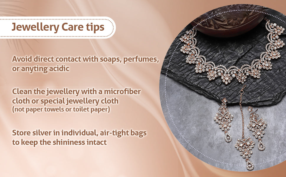 Sukkhi Untamed Rose Gold Plated AD White Stone Collar Bone Necklace Set With Earring And Maangtika | Jewellery Set For Women (NS105635)