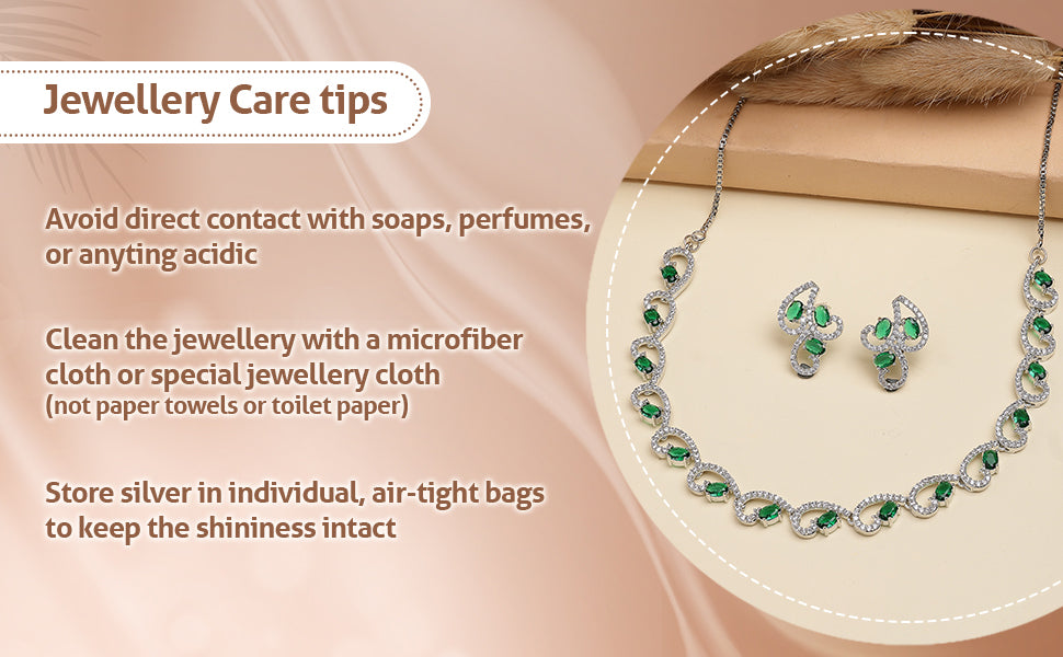 Sukkhi Western Fashion Style Rhodium Plated with Silver Toned Cubic Zirconia Stones Studded Green Choker Necklace with Studs Earring Jewellery Set For Women & Girls|NS107424|Add a touch of elegance to your collection with the Sukkhi Western Fashion Style jewellery set. This set features a rhodium-plated green choker necklace adorned with sparkling silver-toned cubic zirconia stones, paired with matching stud earrings. Crafted for women and girls, it blends contemporary design with timeless appeal, making it suitable for both everyday wear and special events. The rhodium plating provides a polished look that enhances the vibrant green tone of the necklace. This jewellery set offers a stylish way to elevate your outfit, perfect for those seeking a chic and eye-catching accessory that stands out with subtle brilliance.