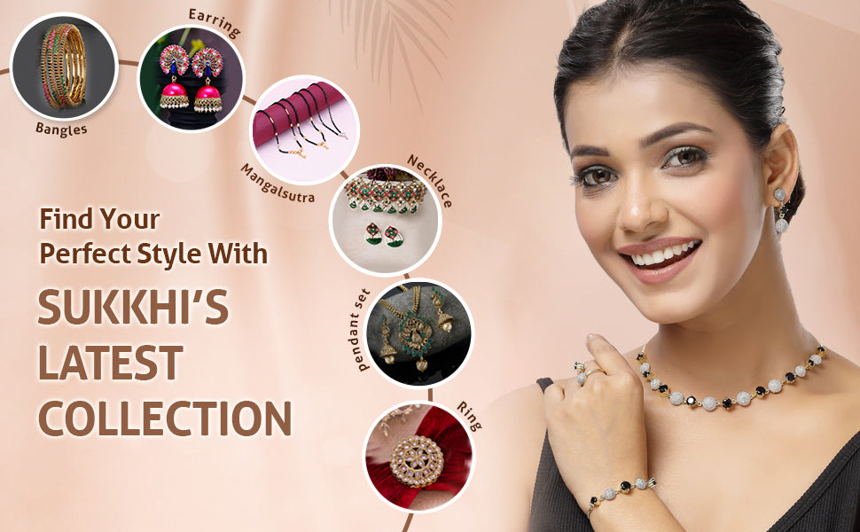Sukkhi Western Stylish Silver Gold Plated American Diamond Studded Choker Necklace with Drop Earring Bracelet & Ring Jewellery Combo Set For Women & Girls|CBMIX107316|Enhance your ensemble with the Sukkhi Western Stylish Silver and Gold Plated Jewellery Combo Set. This elegant collection features a choker necklace studded with sparkling American diamonds, complemented by matching drop earrings, a bracelet, and a ring. The blend of silver and gold plating creates a versatile look that pairs well with both casual and formal outfits. Perfect for parties, celebrations, or special occasions, this set offers a chic and polished finish. Designed for women and girls who appreciate fashionable accessories, it adds a modern touch while maintaining timeless appeal, making it a standout addition to any jewellery collection.