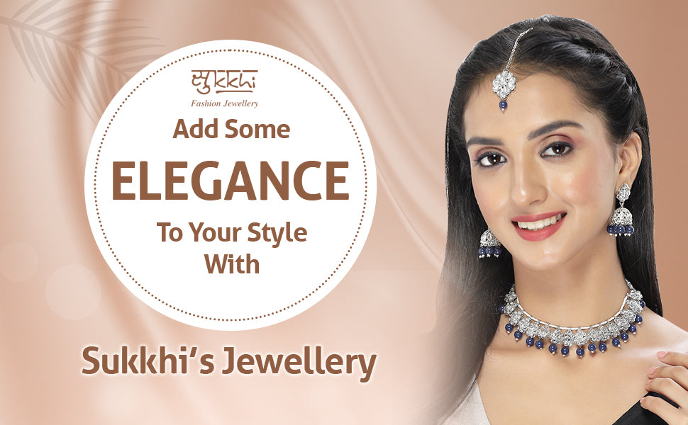 Discover the youthful charm of the Sukkhi Youthful Floral Rhodium Plated Black AD White Stones & Beads Collar Bone Necklace Earring with Maangtika Jewellery Set. This exquisite set exudes elegance, featuring a collar bone necklace adorned with sparkling black AD stones and delicate beads in a radiant silver setting. The floral design adds a touch of freshness to your look. The matching earrings and maangtika (forehead ornament) complete the ensemble, adding a touch of timeless allure to your appearance. Plated in resplendent rhodium, this jewelry set seamlessly blends modern design with sophistication. Whether it's a wedding, party, or any special occasion, the Sukkhi jewelry set will make you stand out with its captivating beauty and poise. A must-have addition to every woman's cherished collection, defining grace and versatility in style.