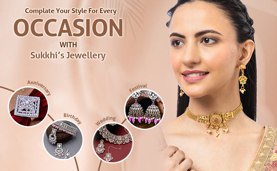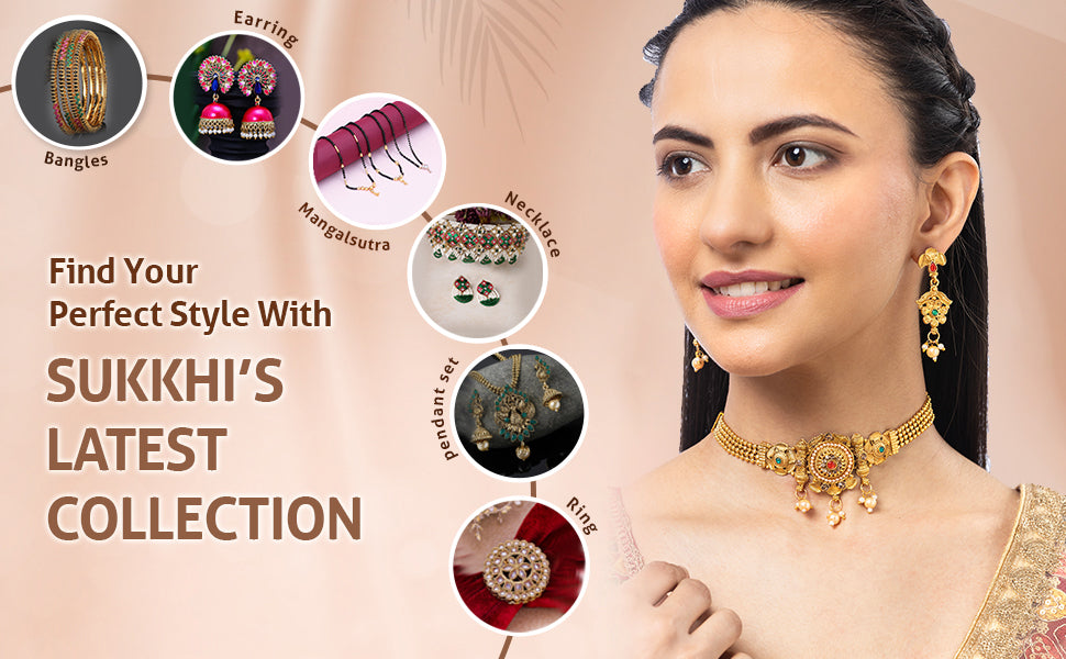 * Elegant Design: Sukkhi traditional gold-plated choker necklace set features a graceful and intricate design, perfect for festive occasions. Gold Plating: Finished with a radiant gold-plated coating, adding a classic touch to your jewelry collection.